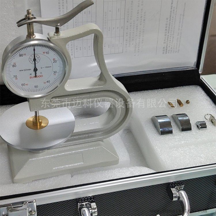 2、使用時(shí)用大拇指壓捏手,使上測頭升起,將被測物置于工作臺上下測頭之間,然后輕放捏手,使之于被測物接觸,此時(shí)表指針的讀數(shù)即為被測物的厚度。為使測量準(zhǔn)確,應(yīng)在同一被測物的不同位置測量數(shù)次,取其平均值;